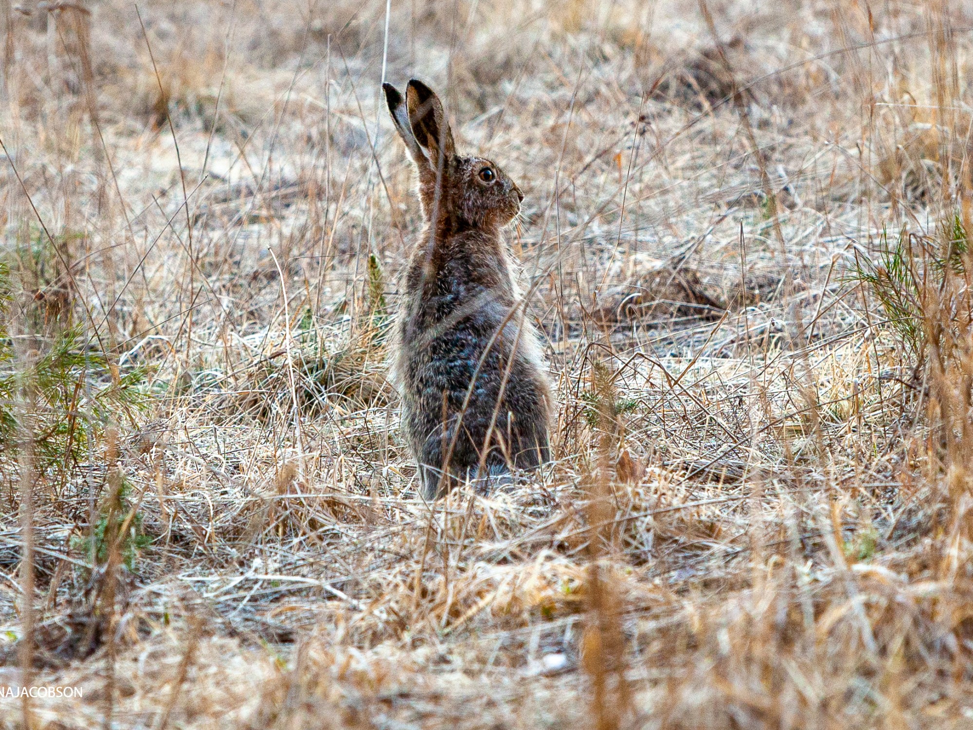 One day I was lucky to detect the brown hare from car. For some reason the hare did not escape but stayed still. I got three hare photos in which the hare is close enough and not running away 🙂